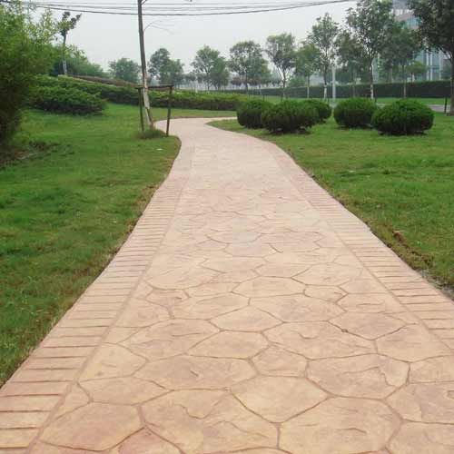 壓模前要事先研究并制訂成型模排列及提放的位置及方向,確保圖案的整體性。將第一塊成型模沿著放樣圖案參照線鋪設,并將其垂直壓進混凝土內(nèi)。施工者可以站立在成型模上,人體自身重量足以使成型模能在混凝土表層形成紋理,必要時可以使用明建成型模專用搗棒把成型模垂直地壓進施工面內(nèi),以更好地壓出清楚逼真的圖案。掌握壓模的時間非常重要,太濕或太干的混凝土表面都會影響最后的圖案及效。